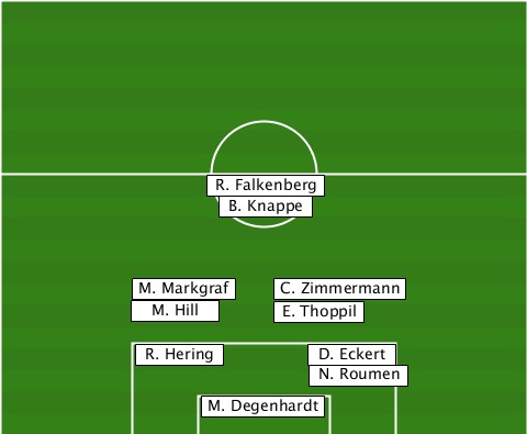--------------R. Falkenberg------ ---------------B. Knappe--------- ---------M. Markgraf-C. Zimmermann ---------M. Hill---E. Thoppil----- ----------R. Hering--D. Eckert---- --------------------N. Roumen---- --------------M. Degenhardt------