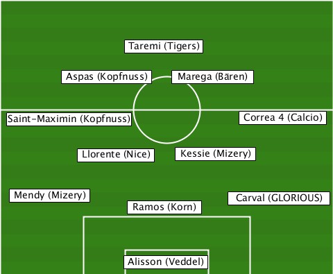 -------------Taremi (Tigers)----- -------Aspas (Kopfnuss)-Marega (Bären) --Saint-Maximin (Kopfnuss)-Correa 4 (Calcio) ---------Llorente (Nice)-Kessie (Mizery) --Mendy (Mizery)-Ramos (Korn)-Carval (GLORIOUS) -------------Alisson (Veddel)----