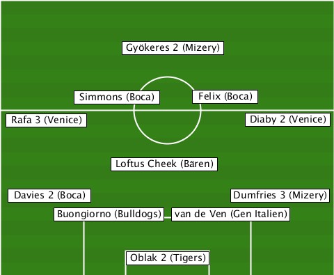 -------------Gyökeres 2 (Mizery)- ---------Simmons (Boca)-Felix (Boca) --Rafa 3 (Venice)---------Diaby 2 (Venice) ------------Loftus Cheek (Bären)- --Davies 2 (Boca)--------Dumfries 3 (Mizery) -------Buongiorno (Bulldogs)-van de Ven (Gen Italien) --------------Oblak 2 (Tigers)---