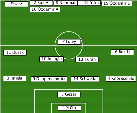 --------2 Boz A------------------ ---Ersatz------8 Naminat-12 Yilmaz-15 Özdemir D --------16 Özdemir A------------- ---------------7 Luley----------- --11 Durak------------------6 Boz U -----------10 Incoglu-13 Turan---- --3 Imiela-9 Depperschmidt-14 Schweda-4 Knörnschild ---------------5 Gezer----------- ---------------1 Stöhr-----------