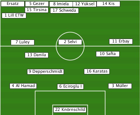 --Ersatz------------------------- -------5 Gezer-8 Imiela-12 Yüksel-14 Kis -------15 Tirsina-17 Schweda------ --1 Lill ETW--------------------- ----7 Luley-----2 Selvi-----11 Erbay -------13 Danila--------10 Safta-- --------9 Depperschmidt-16 Karatas ----4 Al Hamad--6 Eciroglu I-3 Müller --------------22 Knörnschild-----