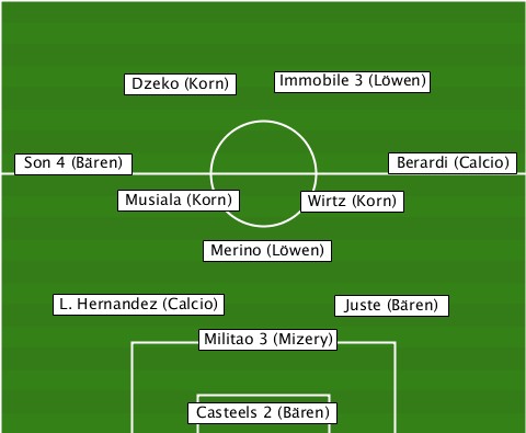 ------------------Immobile 3 (Löwen) ---------Dzeko (Korn)------------ --Son 4 (Bären)-----------Berardi (Calcio) ---------Musiala (Korn)-Wirtz (Korn) --------------Merino (Löwen)----- -----L. Hernandez (Calcio)-Juste (Bären) --------------Militao 3 (Mizery)- -------------Casteels 2 (Bären)--