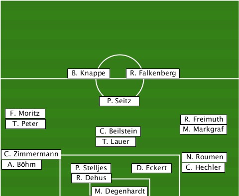 ----------B. Knappe-------------- ------------------R. Falkenberg-- ---------------P. Seitz---------- --F. Moritz-T. Peter-C. Beilstein-M. Markgraf-R. Freimuth --------------T. Lauer----------- --C. Zimmermann------------N. Roumen --A. Böhm---P. Stelljes-D. Eckert-C. Hechler -----------R. Dehus-------------- --------------M. Degenhardt------