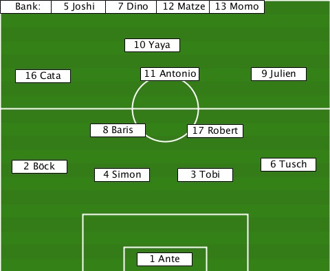 ------5 Joshi-------------------- -Bank:-------7 Dino-12 Matze-13 Momo --------------10 Yaya------------ ---16 Cata------11 Antonio--9 Julien ----------8 Baris----17 Robert---- ---2 Böck---4 Simon--3 Tobi---6 Tusch ---------------1 Ante------------