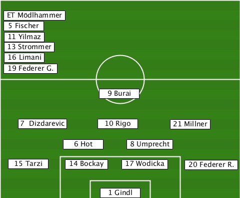 --ET Mödlhammer------------------ --5 Fischer---------------------- --11 Yilmaz---------------------- --13 Strommer-------------------- --16 Limani---------------------- --19 Federer G.------------------ ---------------9 Burai----------- ----7 Dizdarevic-10 Rigo-21 Millner ----------6 Hot----8 Umprecht----- ---15 Tarzi-14 Bockay-17 Wodicka-20 Federer R. ---------------1 Gindl-----------