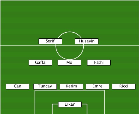 ----------Serif------------------ -------------------Hüseyin------- --------Gaffa---Mo------Fathi------ ---Can----Tuncay-Kerim--Emre---Ricci- ---------------Erkan-------------