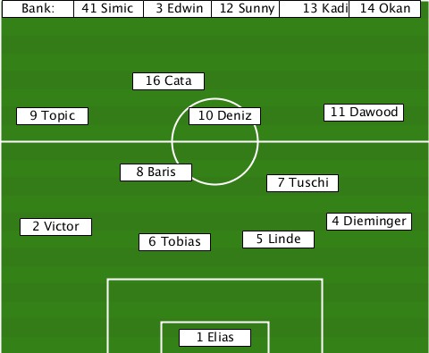 ---------------------------14 Okan --Bank:-41 Simic-3 Edwin-12 Sunny-13 Kadir -----------16 Cata--------------- ---9 Topic-------10 Deniz---11 Dawood ----------8 Baris-----7 Tuschi---- ---2 Victor--6 Tobias-5 Linde-4 Dieminger ---------------1 Elias-----------