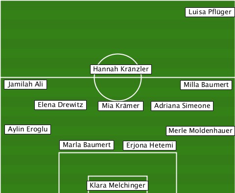 ---------------------------Luisa Pflüger --------------Hannah Kränzler---- --Jamilah Ali--------------Milla Baumert ------Elena Drewitz-Mia Krämer-Adriana Simeone --Aylin Eroglu-----------Merle Moldenhauer ----------Marla Baumert-Erjona Hetemi -------------Klara Melchinger----