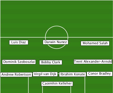 --------------Darwin Nunez------- ----Luis Diaz------------Mohamed Salah --Dominik Szoboszlai-Bobby Clark-Trent Alexander-Arnold -Andrew Robertson-Virgil van Dijk-Ibrahim Konate-Conor Bradley -------------Caoimhin Kelleher---