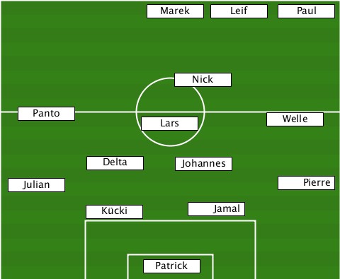 ----------------------------PAUL- ---------------Marek--Leif-------- ------------------Nick----------- ---Panto--------Lars---------Welle- ----------Delta----Johannes------- --Julian---------------------Pierre ----------Kücki-----Jamal--------- ---------------PATRICK-----------