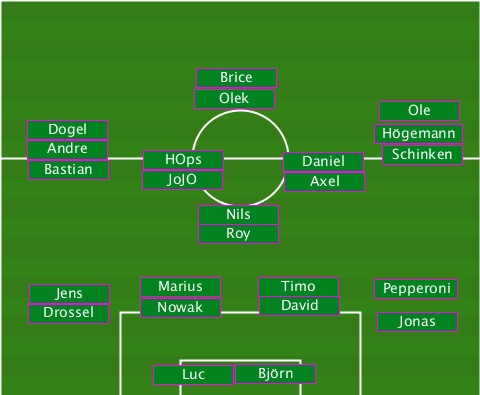 ---------------Brice------------- --------------Olek----------Ole--- ---Dogel-------------------Högemann ---Andre-Bastian-JoJO-HOps-Daniel-Axel-Schinken ---------------Nils-------------- ---------------Roy--------------- ---Drossel-Jens-Marius-Nowak-Timo-David-Pepperoni-Jonas ------------Luc---Björn-----------