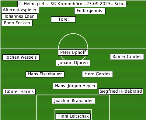 -----12. Heimspiel ... SG Krummhörn...25.09.2025...Schule --Alternativspieler:-Endergebnis:- --Bodo Focken-Johannes Eden-Tore:-- --Jochen Wessels-Peter Uphoff-Rainer Cordes --------------Johann Djuren------ -------Hans Eisenhauer-Hero Gerdes -------------Hans-Jürgen Heyen--- --Günter Harms----------Siegfried Hildebrand -------------Joachim Brabander--- --------------Hinni Leitschak----