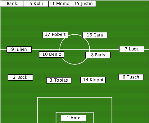 ------------11 Momo-------------- -Bank:--5 Kolli----15 Justin------- -----------17 Robert-16 Cata------ ---9 Julien-----------------7 Luca ----------10 Deniz---8 Baris------ ---2 Böck---3 Tobias-14 Kloppi-6 Tusch ---------------1 Ante------------