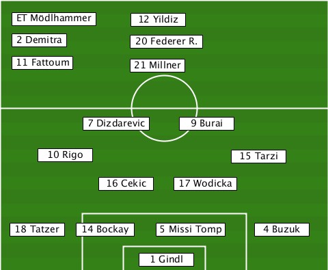 ---ET Mödlhammer----------------- --------------12 Yildiz---------- ---2 Demitra---20 Federer R.------ ---11 Fattoum--21 Millner--------- ----------7 Dizdarevic-9 Burai---- -----10 Rigo-------------15 Tarzi- -----------16 Cekic-17 Wodicka---- --18 Tatzer-14 Bockay-5 Missi Tomp-4 Buzuk ---------------1 Gindl-----------