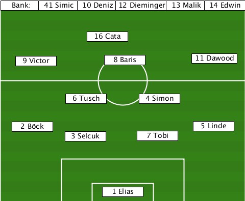 ----------------------------14 Edwin --Bank:-41 Simic-10 Deniz-12 Dieminger-13 Malik -------------16 Cata------------- ---9 Victor-----8 Baris-----11 Dawood ----------6 Tusch----4 Simon------ ---2 Böck-------------------5 Linde ----------3 Selcuk--7 Tobi-------- ---------------1 Elias-----------
