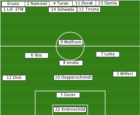 -----------------------13 Danila- --Ersatz-2 Naminat-4 Turan-11 Durak- --1 Lill ETW-14 Schweda-15 Tirsina ---------------9 Wolfrum--------- -------6 Boz------------7 Luley--- ---------------8 Imiela---------- --12 Dick------10 Depperschmidt-3 Wilfert --------------5 Gezer------------ --------------22 Knörnschild-----