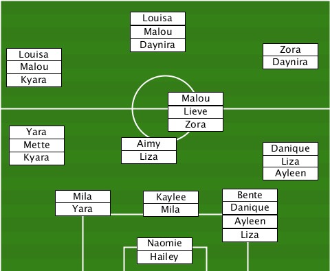 --------------Louisa------------- --------------Malou-------------- --Louisa-Malou--Daynira-------Zora-Daynira --Kyara-------------------------- ------------------Malou---------- ------------------Lieve---------- --Yara-------------Zora----------- --Mette-Kyara--Aimy-Liza-------Danique-Liza ---------------------------Ayleen -------Mila-----Kaylee---Bente----- -------Yara-----Mila-----Danique--- -----------------------Ayleen---- ---------------Naomie---Liza------ ---------------Hailey------------