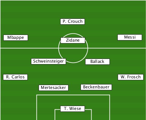 ---------------P. Crouch--------- --Mbappe--------Zidane-------Messi- --------Schweinsteiger-Ballack---- --R. Carlos-----------------W. Frosch ----------Mertesacker-Beckenbauer- ---------------T. Wiese----------