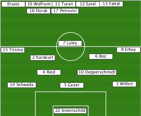 ------------------------13 Fattal --Ersatz-10 Wolfrum-11 Turan-12 Saral --------16 Durak-17 Petrovici----- ---------------7 Luley----------- --15 Tirsina-----------------8 Erbay --------2 Karakurt-----6 Boz------ ----------4 Ried----10 Depperschmidt ---14 Schweda---5 Gezer------3 Wilfert --------------22 Knörnschild-----