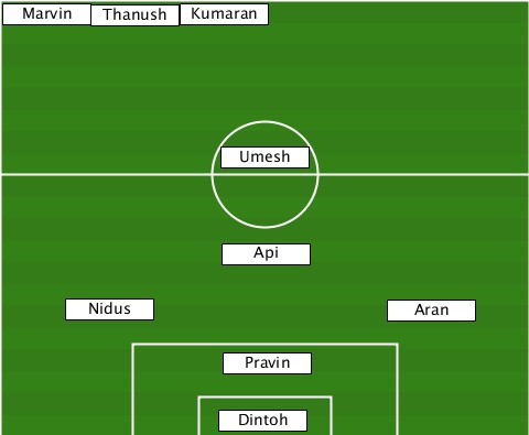 ------------Kumaran-------------- --Marvin-Thanush------------------ ---------------Umesh------------- ---------------Api--------------- -----Nidus----------------Aran---- ---------------Pravin------------ ---------------Dintoh------------