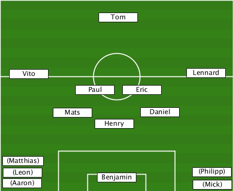 ---------------Tom--------------- ---Vito---------------------Lennard ------------Paul---Eric----------- ---------Mats---------Daniel------ --------------Henry-------------- --(Matthias)--------------------- --(Aaron)-(Leon)-Benjamin------(Philipp)-(Mick)