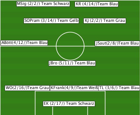 -----MSig (2/2/) Team Schwarz---- -------------------KR (4/14/)Team Blau -------SOPram (3/14/) Team Gelb-KJ (2/2/) Team Grau --ABött(4/12/)Team Blau-JSaut(2/8/)Team Blau -------------JBro (5/11/) Team Blau ---WO(2/16/)Team Grau-KFrank(4/9/)Team Weiß-TL (3/6/) Team Blau -----------EK (2/17/) Team Schwarz
