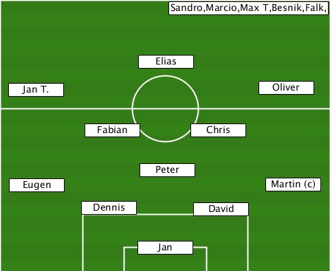 ------------------Sandro,Marcio,Max T,Besnik,Falk, ---------------Elias------------- --Jan T.--------------------Oliver ----------Fabian-----Chris-------- ---------------Peter------------- --Eugen---------------------Martin (C) ---------Dennis------David-------- ---------------Jan---------------