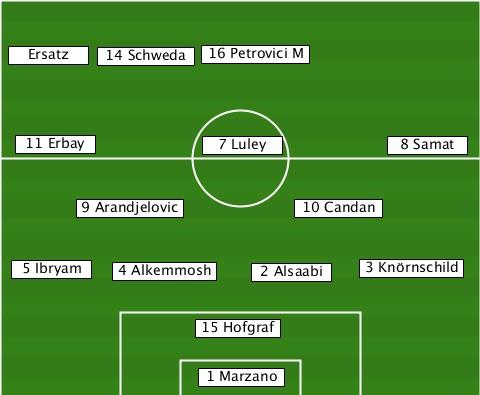 ---------------16 Petrovici M---- --Ersatz-14 Schweda--------------- --11 Erbay------7 Luley------8 Samat -------9 Arandjelovic-10 Candan--- --5 Ibryam-4 Alkemmosh-2 Alsaabi-3 Knörnschild --------------15 Hofgraf--------- ---------------1 Marzano---------