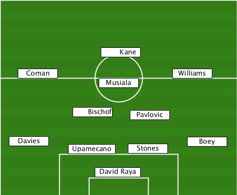---------------Kane-------------- ----Coman-----------------Williams ---------------Musiala----------- -----------Bischof--Pavlovic------ ---Davies---Upamecano-Stones--Boey-- --------------David Raya---------
