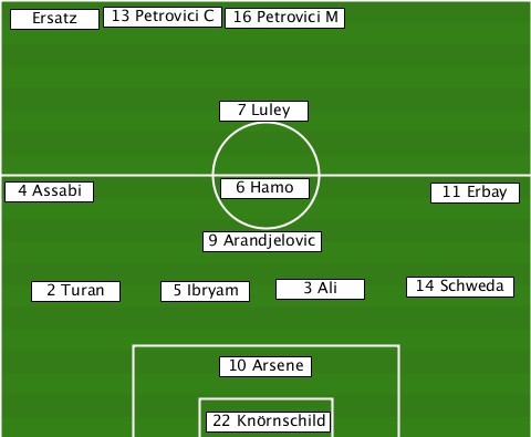 --------13 Petrovici C----------- --Ersatz--------16 Petrovici M---- ---------------7 Luley----------- --4 Assabi------6 Hamo-------11 Erbay --------------9 Arandjelovic----- ---2 Turan--5 Ibryam-3 Ali---14 Schweda ---------------10 Arsene--------- --------------22 Knörnschild-----