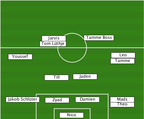 --------------------Tamme Boss--- -----------Jarvis---------------- ----------Tom Lüthje------------- ---Youssef-----------------Tamme-Leo -----------Till----Jaden---------- ---Jakob Schlüter-Zyad-Damien-Mads-Theo ---------------Nico--------------