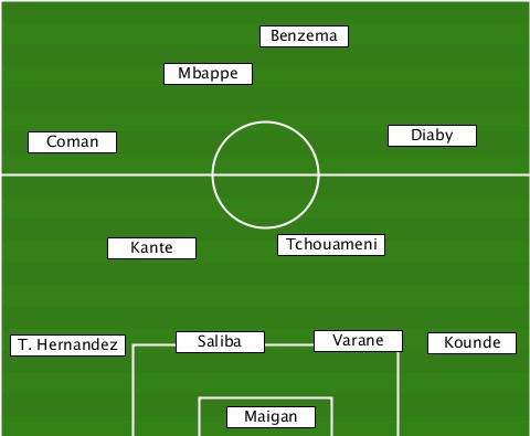 -----------------Benzema--------- -----------Mbappe---------------- ---Coman------------------Diaby--- --------Kante------Tchouameni----- --T. Hernandez-Saliba-Varane--Kounde ---------------Maigan------------