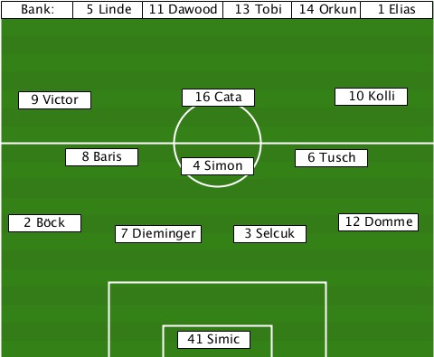 ----------------------------1 Elias --Bank:-5 Linde-11 Dawood-13 Tobi-14 Orkun ---9 Victor-----16 Cata-----10 Kolli ------8 Baris---4 Simon--6 Tusch--- --2 Böck---7 Dieminger-3 Selcuk-12 Domme ---------------41 Simic----------
