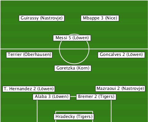 -------------------Mbappe 3 (Nice) ------Guirassy (Nastrovje)------- -------------Messi 5 (Löwen)----- ---Terrier (Oberhausen)-Goncalves 2 (Löwen) -------------Goretzka (Korn)----- --T. Hernandez 2 (Löwen)-Mazraoui 2 (Nastrovje) ---------Alaba 3 (Löwen)-Bremer 2 (Tigers) -------------Hradecky (Tigers)---