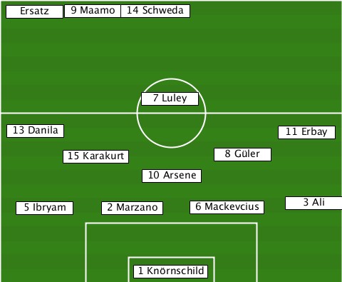 -------9 Maamo------------------- --Ersatz------14 Schweda---------- ---------------7 Luley----------- --13 Danila-----------------11 Erbay -------15 Karakurt----8 Güler----- ---------------10 Arsene--------- ---5 Ibryam-2 Marzano-6 Mackevcius-3 Ali --------------1 Knörnschild------
