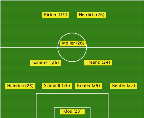 -----------Ricken (19)----------- -------------------Herrlich (26)- ---------------Möller (26)------- --------Sammer (26)--Freund (24)-- ---Heinrich (25)-Schmidt (26)-Kohler (29)-Reuter (27) ---------------Klos (23)---------