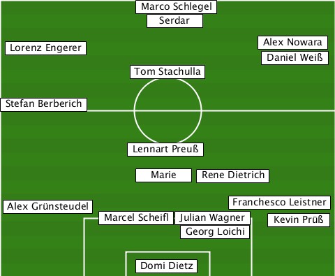 --------------Marco Schlegel----- ---------------Serdar------------ --Lorenz Engerer-----------Alex Nowara-Daniel Weiß --------------Tom Stachulla------ -Stefan Berberich---------------- --------------Lennart Preuß------ --------------Marie--Rene Dietrich --Alex Grünsteudel------Franchesco Leistner -----------Marcel Scheifl-Julian Wagner-Kevin Prüß -------------------Georg Loichi-- --------------Domi Dietz---------