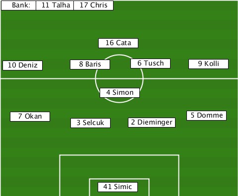 ------11 Talha------------------- --Bank:-----17 Chris-------------- ---------------16 Cata----------- --10 Deniz--8 Baris--6 Tusch--9 Kolli ---------------4 Simon----------- ---7 Okan---3 Selcuk-2 Dieminger-5 Domme ---------------41 Simic----------