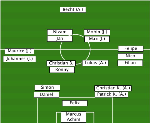 --------------Becht (A.)--------- ------------Nizam---Mobin (J.)---- ------------Jan-----Max (J.)------ --Maurice (J.)--------------Felipe --Johannes (J.)-Christian B.-Lukas (A.)-Filian-Nico ------------Ronny---------------- ---------Simon---------Christian K. (A.) ---------Daniel--------Patrick K. (A.) ---------------Felix------------- --------------Marcus------------- --------------Achim--------------