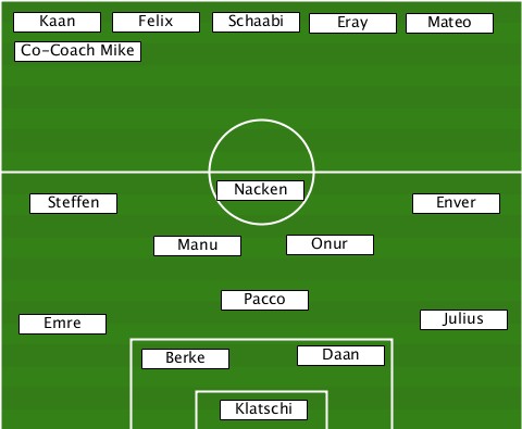 --------------Schaabi------------ --Kaan---Felix--------Eray---Mateo-- --Co-Coach Mike------------------ ---Steffen------Nacken-------Enver- -----------Manu-----Onur---------- ---------------Pacco------------- ---Emre---------------------Julius ----------Berke------Daan--------- ---------------Klatschi----------