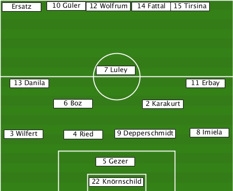 --------10 Güler----------------- --Ersatz------12 Wolfrum-14 Fattal-15 Tirsina ---------------7 Luley----------- ---13 Danila----------------11 Erbay ---------6 Boz--------2 Karakurt-- --3 Wilfert-4 Ried-9 Depperschmidt-8 Imiela ---------------5 Gezer----------- --------------22 Knörnschild-----