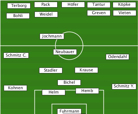 ---------Pack-------------------- ---Terborg-------Höfer--Tantur-Köpke ---Bohli--Weidel--------Greven-Vieten -----------Jochmann-------------- --Schmitz C.---Neubauer-----Odendahl -----------Stadler--Krause-------- --Kohnen----Helm-Bichel-Hemb---Schmitz Y. ---------------Fuhrmann----------