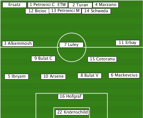 --Ersatz------------------------- --------1 Petrovici C ETW-2 Turan-4 Marzano -------12 Bicioc-13 Petrovici M-14 Schweda --3 Alkemmosh---7 Luley------11 Erbay --------9 Bulat C-----15 Cotoranu- --5 Ibryam--10 Arsene-8 Bulat V-6 Mackevcius --------------16 Hofgraf--------- --------------22 Knörnschild-----