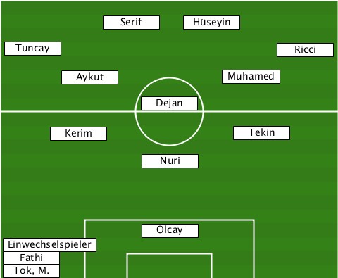 -------------------Hüseyin------- -----------Serif----------------- --Tuncay---------------------Ricci -------Aykut-----------Muhamed---- ---------------Dejan------------- ------Kerim--------------Tekin---- ---------------Nuri-------------- ---------------Olcay------------- --Einwechselspieler-------------- --Fathi-------------------------- --Tok, M.------------------------
