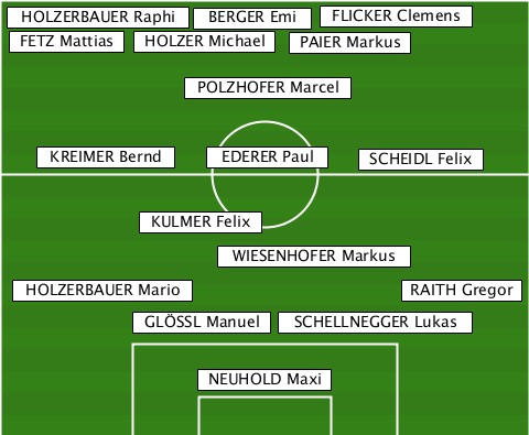 ---------------------FLICKER Clemens --HOLZERBAUER Raphi-BERGER Emi---- --FETZ Mattias-HOLZER Michael-PAIER Markus -------------POLZHOFER Marcel---- ----KREIMER Bernd-EDERER Paul-SCHEIDL Felix ----------KULMER Felix----------- ---------------WIESENHOFER Markus --HOLZERBAUER Mario--------RAITH Gregor ---------GLÖSSL Manuel-SCHELLNEGGER Lukas -------------NEUHOLD Maxi--------