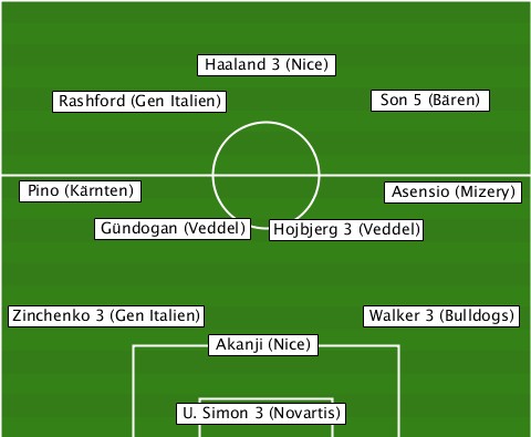 -------------Haaland 3 (Nice)---- -----Rashford (Gen Italien)-Son 5 (Bären) ---Pino (Kärnten)---------Asensio (Mizery) -------Gündogan (Veddel)-Hojbjerg 3 (Veddel) --Zinchenko 3 (Gen Italien)-Walker 3 (Bulldogs) --------------Akanji (Nice)------ ------------U. Simon 3 (Novartis)
