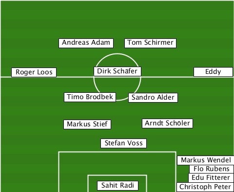 ---------Andreas Adam------------ ------------------Tom Schirmer--- ---Roger Loos--Dirk Schäfer---Eddy- ----------Timo Brodbek-Sandro Alder ----------Markus Stief-Arndt Schöler ---------------Stefan Voss------- --------------------------Markus Wendel ---------------------------Flo Rubens ---------------------------Edu Fitterer ---------------Sahit Radi--Christoph Peter