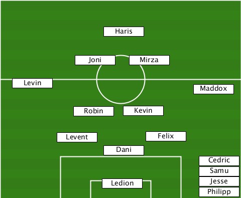 ---------------Haris------------- -----------Joni-----Mirza--------- ---Levin--------------------Maddox -----------Robin---Kevin---------- ---------Levent-------Felix------- ---------------Dani-------------- ----------------------------Cedric ----------------------------Samu- ---------------Ledion--------Jesse ----------------------------Philipp