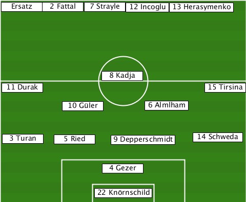 -------2 Fattal------------------ --Ersatz-----7 Strayle-12 Incoglu-13 Herasymenko ---------------8 Kadja----------- --11 Durak-------------------15 Tirsina ----------10 Güler---6 Almlham---- --3 Turan-5 Ried--9 Depperschmidt-14 Schweda ---------------4 Gezer----------- --------------22 Knörnschild-----