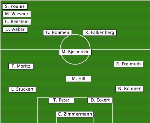 --S. Younis---------------------- --M. Wiesner--------------------- --C. Beilstein------------------- --D. Weber--G. Roumen-R. Falkenberg --------------M. Bjelanovic------ ---F. Moritz---------------R. Freimuth ----------------M. Hill---------- ---L. Stuckert-------------N. Roumen ------------T. Peter-D. Eckert---- -------------C. Zimmermann-------